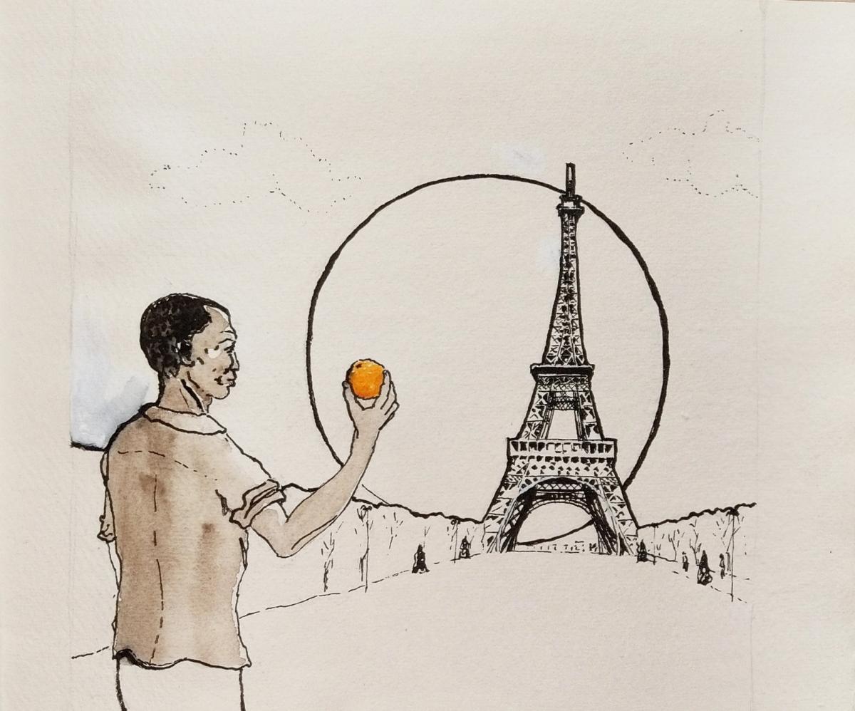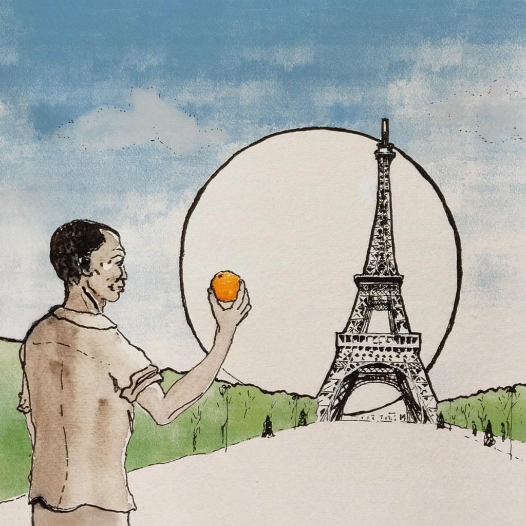 For this picture, I found statistics on the median (average) wealth of a world citizen and the world's richest person (Jeff Bezos at the time of drawing) and calculated that if the median wealth was the volume of an orange, Bezos’ wealth would be a giant ball the size of the Eiffel Tower, i.e. disgustingly wealthy.