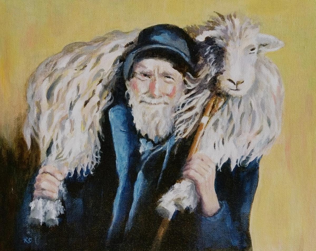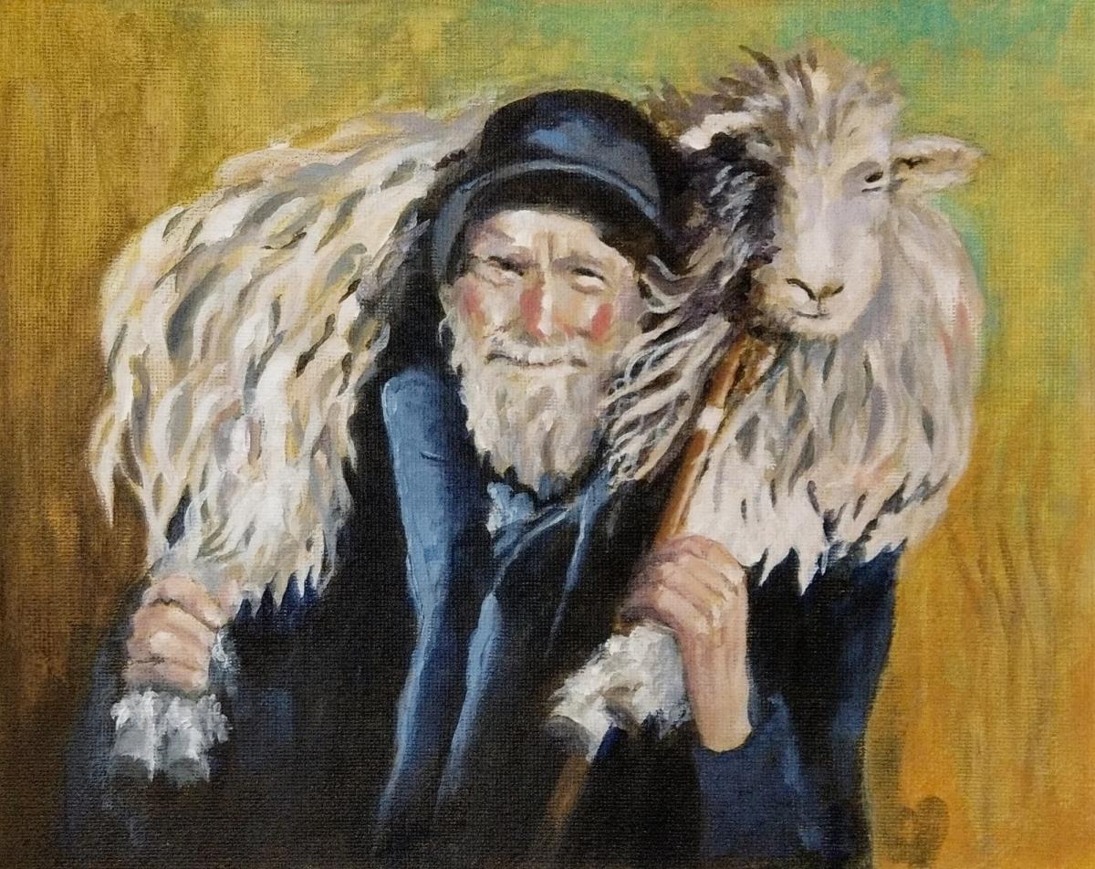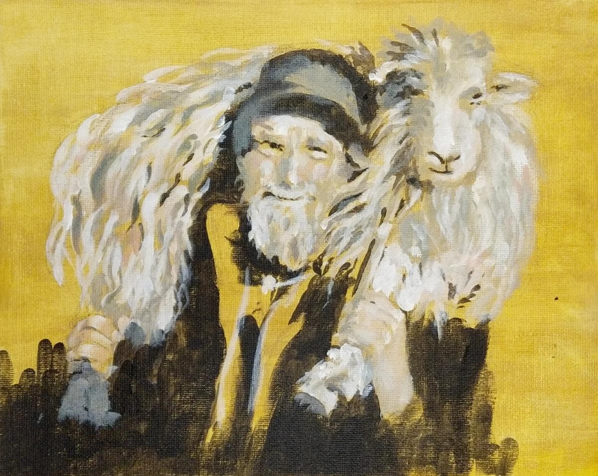 Request: paint this shepherd from a black and white photograph in a book about rural life in the Lake District that dates from the 1960s. We later identified the shepherd as Isaac Cookson from ??? [need to check details].