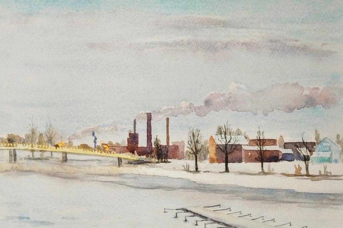 I was trying to use a masking fluid technique to make the lights on the bridge glow. It worked okay, but I could have used a stronger contrast around the lights before removing the mask.
